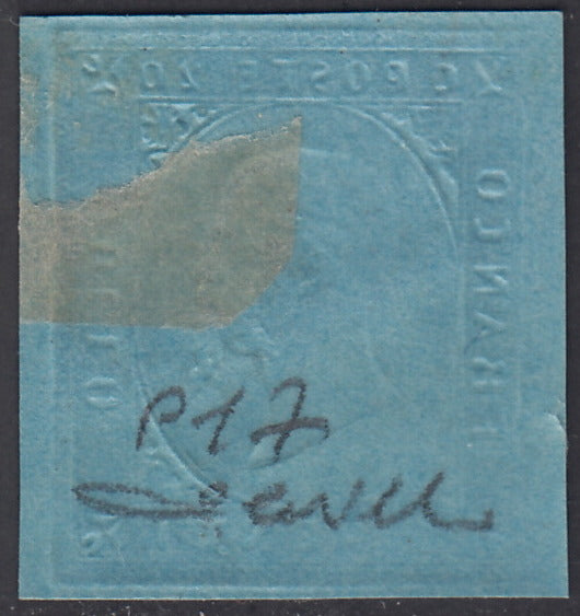 SARD217 - 1853 - Prova della II emissione c. 20 azzurro su carta spessa nuova con gomma (P17)