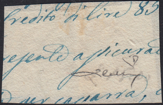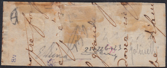 BO2511_59 - 1861 - Frammento Napoli al Porto 31/8/61 affrancato con gr. 5 rosso carminio + gr. 10 bistro oliva + gr. 20 giallo (21 + 22b + 23)