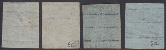 PV1599 - 1851 - Leone di Marzocco, I emissione lotto comprendente 2 cr. azzurro grigio e 2 cr. azzurro vivo su azzurro + 2 cr. Azzurro verdastro + 2 cr verde azzurro su carta grigia usati. (5a, 5b, 5e, 5f).