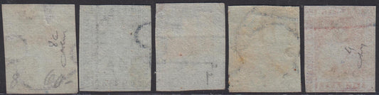 32_97 - 1851 - Leone di Marzocco serietta di cinque valori comprendente 1, 2, 4, 6 e 9 crazie su carta grigia e filigrana corona nei colori base (4, 5, 6, 7, 8).