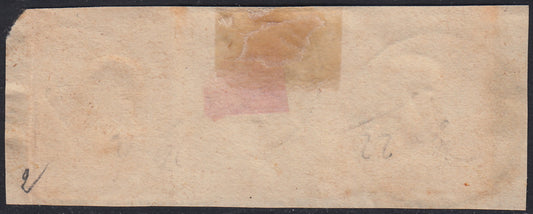 SRD462 - 1863 - IV emissione, frammento affrancato con c. 10 bistro arancio due esempari + c. 40 rosa vermiglio usati a Forlì 12/2/63 (14Df + 16F).