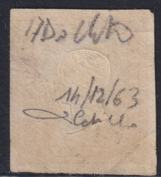 F9_123 - 1858/62 - IV emissione c. 80 giallo tiratura 1862 usato con annullo del Dicembre 1863, (17Da).