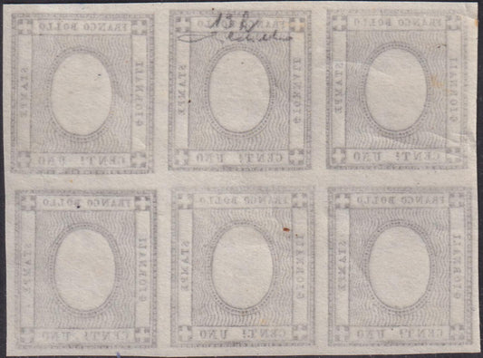 1861 - Stampati, c. 1 grigio nero, blocco di 6 senza impressione della cifra "1", nuovo integro (19h)