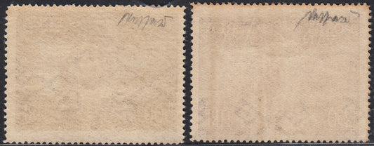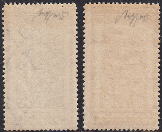 Vat9 - 1946 - Segnatasse, emissione nuova tiratura con linee del fondo più grosse, 5c. giallo e c. 20 violetto chiaro nuovi gomma integra (13, 14)