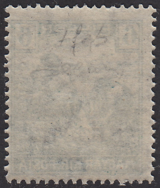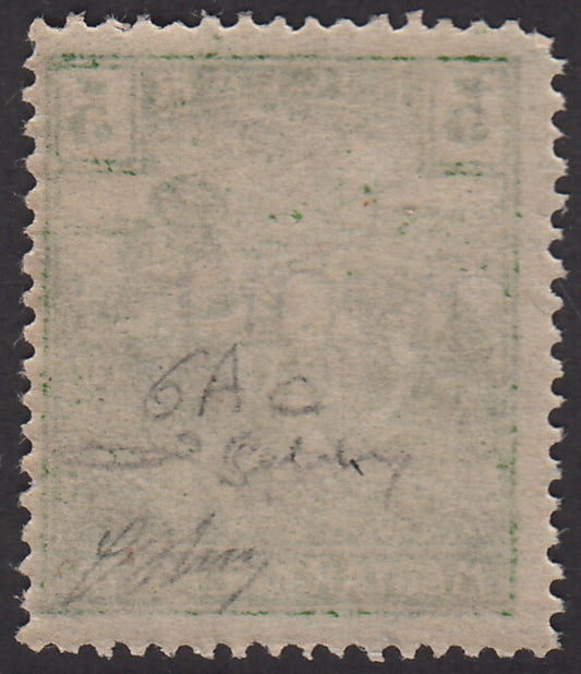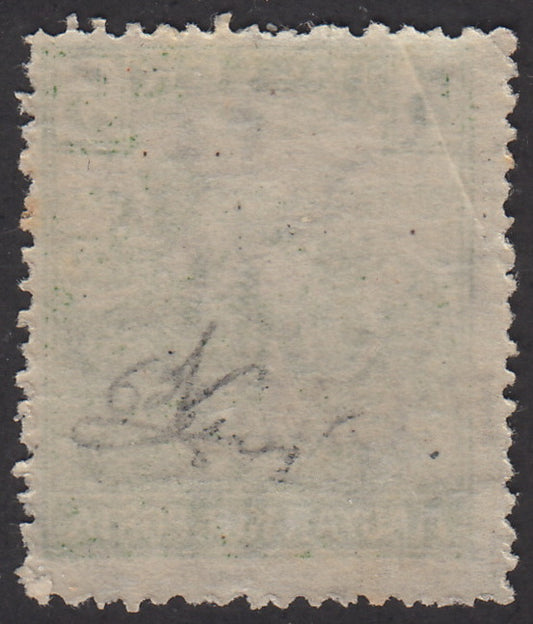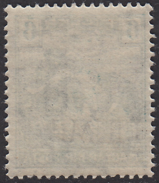 V149 - 1918 - Francobollo d'Ungheria della serie Mietitori, 6 filler verde azzurro con soprastampa a macchina FIUME fortemente spostata in basso, nuovo integro (6fab)