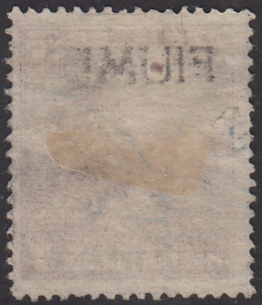 V159 - 1918 - Francobollo d'Ungheria della serie Mietitori, 25 filler azzurro con soprastampa a macchina FIUME fortemente spostata a sinistra, usato (11fd)