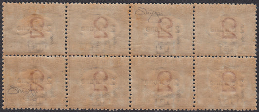 Dalma4 - 1922 - Terre redente - Dalmazia, segnatasse d'Italia soprastampate con nuovo valore, L. 2 carminio e azzurro blocco di otto esemplari di cui una quartina integra e una linguellata (3)