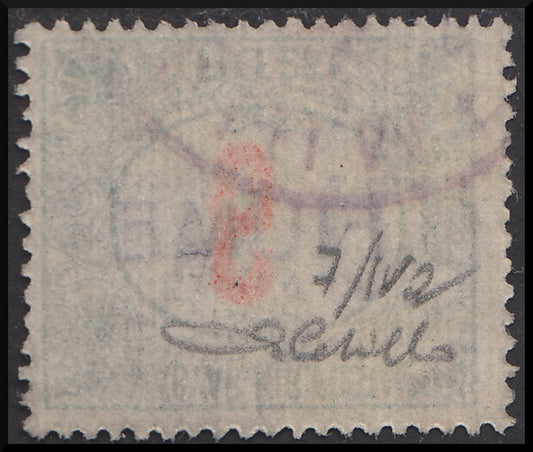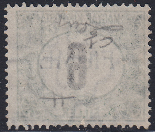 Fiume230 - 1918 - Segnatasse d'Ungheria 2 filler rosso e verde con soprastampa FIUME a mano del IV tipo capovolta, usato (5/IVa).