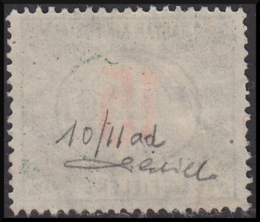 Fiume229 - 1918 - Segnatasse d'Ungheria 10 filler rosso e verde con soprastampa FIUME a mano del II tipo capovolta, usato (8/IIa).