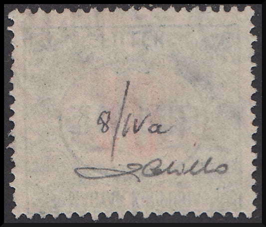 Fiume232 - 1918 - Segnatasse d'Ungheria 10 filler rosso e verde con soprastampa FIUME a mano del IV tipo capovolta, usato (8/IVa).