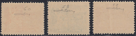 Fiume343 - Francobolli Pro Fondazione Studio soprastampati Valore Globale in caratteri picoli e neretto e Segnatasse, 0,20, 0,60 e 0,80 su oliva, nuovi con gomma (36/38)