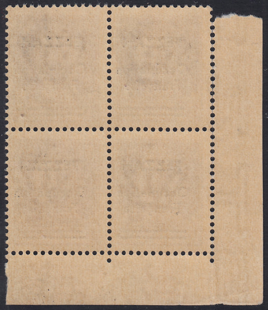 1945 - Occupazione francese del Fezzan, francobollo d'Italia della serie Imperiale c. 50 violetto soprastampato FEZZAN Occupation Francaise e sbarrette su Poste Italiane nuovo con gomma integra in quartina (1).