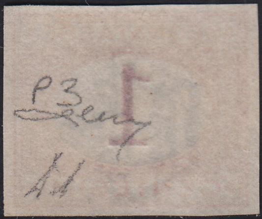 Prova1 - 1854 - TELEGRAFI SARDI, su fondo della III emissione I composizione su cartoncino, L.1 rame e verde chiaro nuovo non gommato (S5)