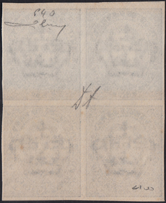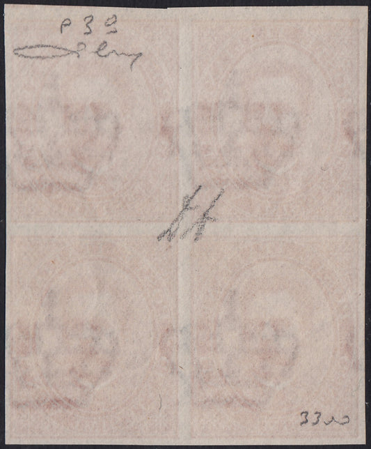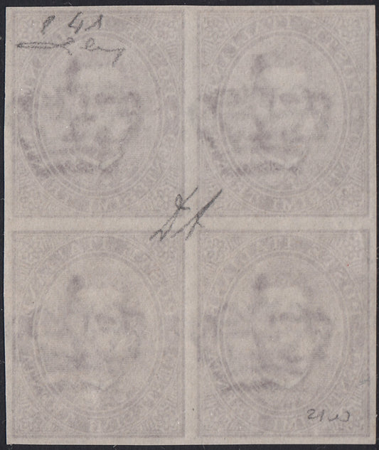 UMB25 - 1889 - Effigie di Umberto I, I emissione c. 30 bruno prova d'archivio non dentellata blocco di 4 nuovo con gomma integra (P41)