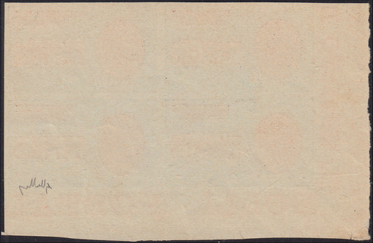 PP1056 - 1922 - L. 1,20 azzurro e rosso, prova di macchina proveniente dall'unico foglio noto di 50 esemplari, blocco di quattro esemplari nuovo non gommato. Splendido. (E8, prova).