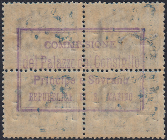 SM36 - 1892 - Stemma della Repubblica, c. 5 su c. 10 azzurro blocco di quattro esemplari nuovo con gomma integra, il quarto con varietà "Linea sottile" (8 + 8q)