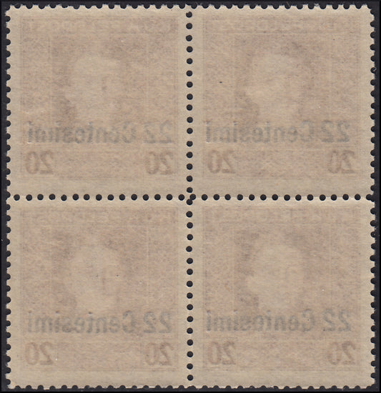 A04 - 1918 - Occupazione Austriaca del Friuli e del Veneto, francobolli di Austria soprastampati, c.22 su 20 bruno dentellatura 11 1/2 invece che 12 1/2, blocco di quattro esemplari nuovo con gomma integra (9aa)