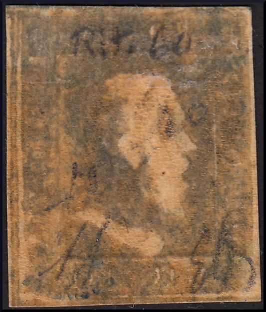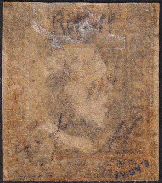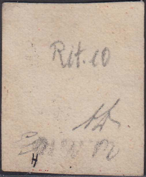 Effigie di Ferdinando II di Borbone, 5 grana rosa carminio I tavola carta di Napoli (9) usato, ritocco 10