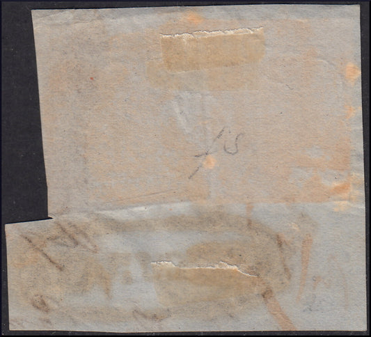 SIC38 - 1859 - 5 grana carminio I tavola + 2 grana cobalto II tavola entrambi carta di Napoli, su frammento con impronta ASSICURATA in ovale in basso. (7b + 9a).