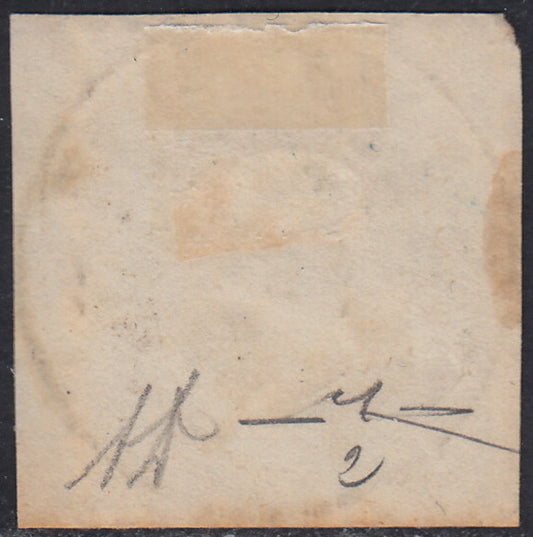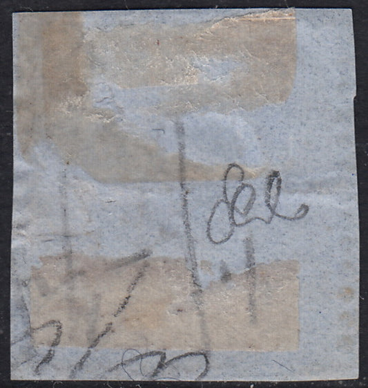 UT54 - 1863 - Emissione litografica tipo Sardegna c.15 indaco con riflessi violaceo striscia di 4 esemplari usata su frammento (11g)