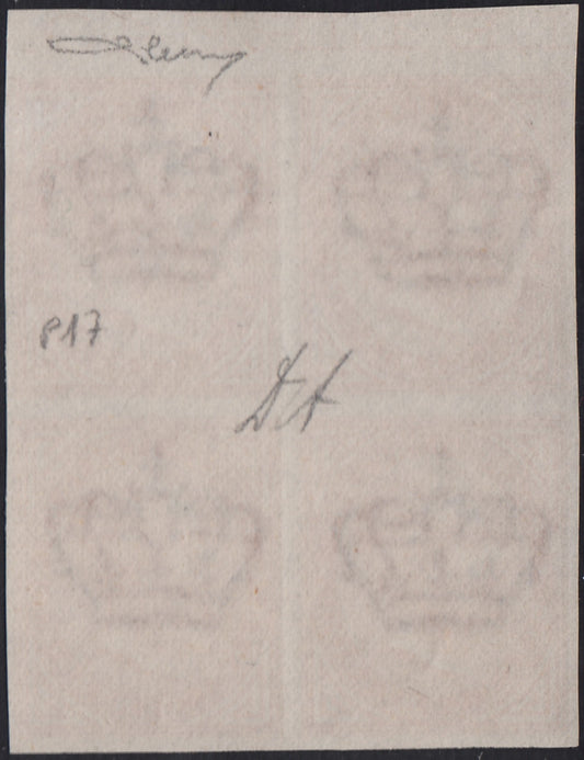 VEII125 - 1863 - Emissione De La Rue, c.40 rosa carminio tiratura di Londra blocco di 4 della prova d'archivio nuova gomma integra (P20)