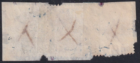 F21_30 - 1865 - Frammento affrancato con tre francobolli emissione De La Rue tiratura di Londra, annullati con tratti di penna poi ripassati con dicitura "Cesena 20 luglio 1865, annullatore guasto". (L16, L17, L20).