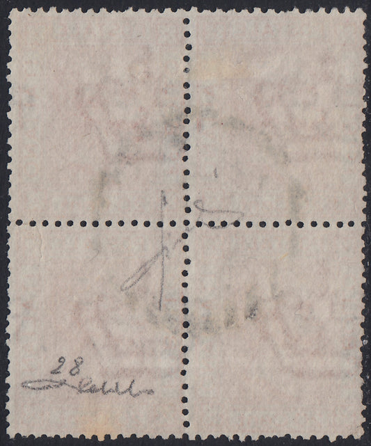 VEII36 - 1877 - Effigie di Vittorio Emanuele II volta a sinistra, nuovo formato e cambiamento di colore, c. 20 arancio blocco di 4 esemplari usato, (28).