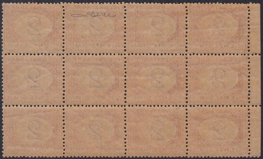 VEII111 - 1870 - Segnatasse, c. 2 ocra e carminio blocco di 12 esemplari nuovo con gomma integra (4).