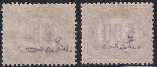 F21_44 - 1875 - Francobolli di Servizio, L. 5 lacca e L. 10 lacca usati con annulli originali. (7, 8).