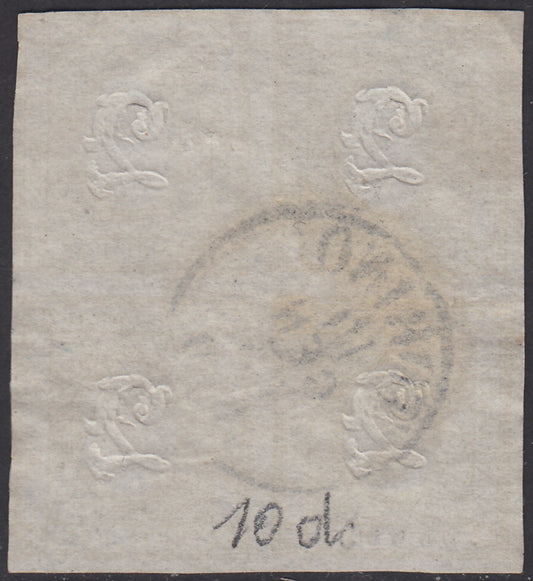 E7_141 - 1863 - Emissone dentellata, c. 10 bistro giallastro in affrancatura mista con ex IV emissione di Sardegna c. 5 verde giallastro chiaro, su frammento con annullo di S. Sofia (1 + 13Db).