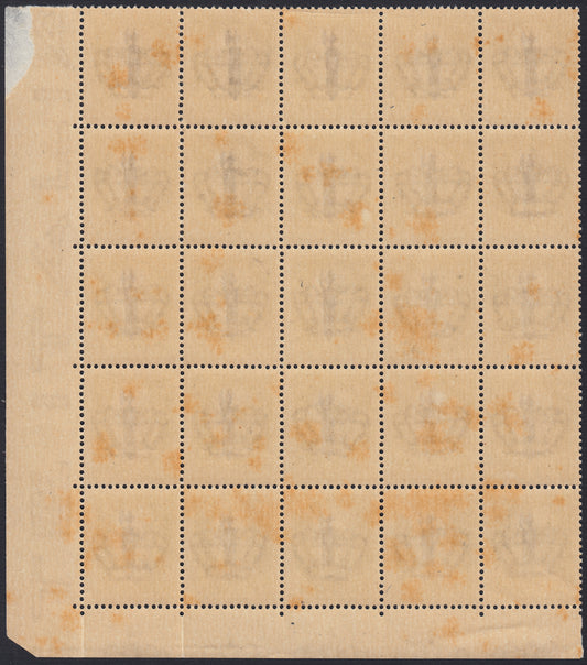 RSI555 - 1944 - Imperiale di Regno c. 30 bruno soprastampa tipo "l" in nero errore di colore della sopraastampa, blocco di 25 esemplari nuovo integro (492A)