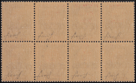 R.S.I. c. 50 violetto blocco di 8 esemplari con sopratampa rosso arancio fortemente spostata in alto (493Ep)