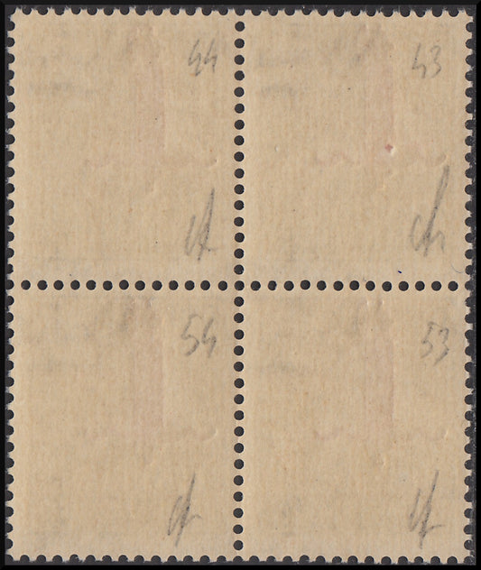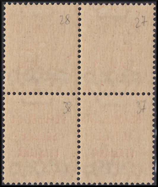 R.S.I. - Saggi di soprastampa, Posta Aerea L 1 violetto blocco di 4 esemplari con soprastampa rossa tipo "m" (P15) nuovo integro