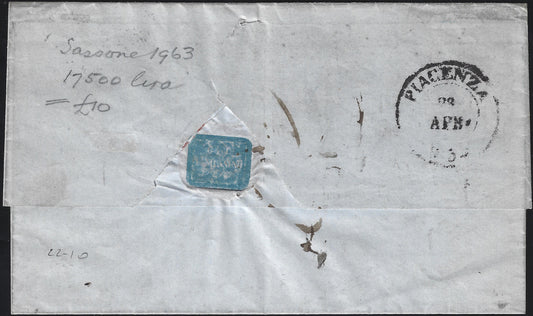 E10_69 - 1854 - Lettera spedita da Torino per Piacenza affrancata con II emissione c. 20 azzurro usato TORINO 27/4/54, tassata 3 decimi a destino per mancanza di convenzione postale (5).