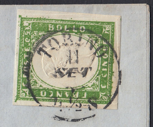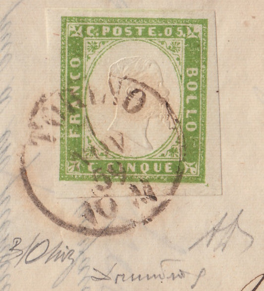 SardSP174 - 1859 - Lettera spedita da Torino per città 7/11/59, affrancata con c. 5 verde giallo brillante II composizione tiratura 1859 isolato, raro e molto bello. (13B).
