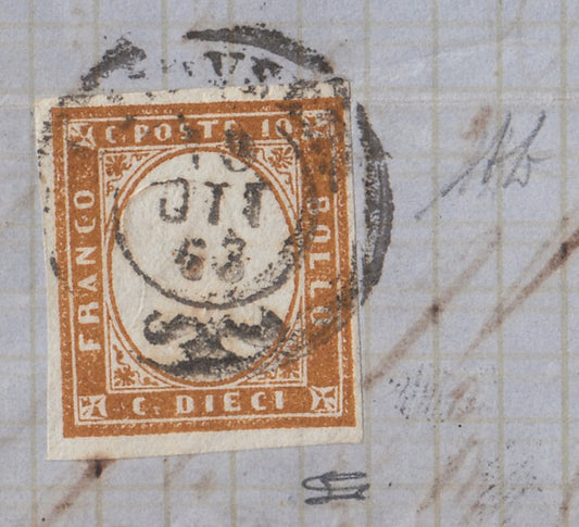 SardSP186 - 1862 Lettera spedita da Pisa per Cecina 5/3/62 affrancata con c. 10 bistro oliva II tavola (14D).