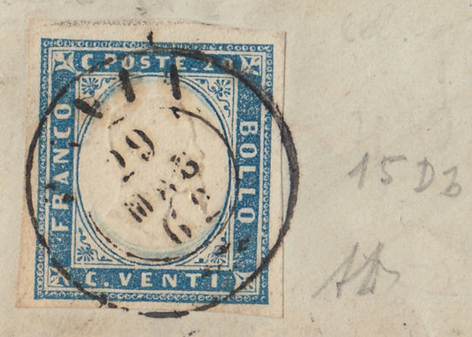 196 - 1857 - Lettera spedita da Genova per Levanto 19/12/57 affrancata con c. 20 Azzurro grigiastro I tavola tiratura 1857 (15A)