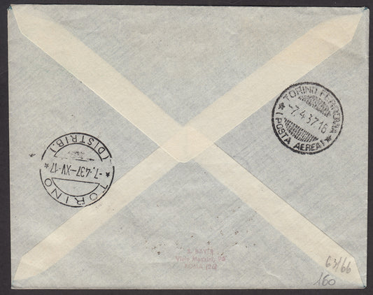 PA154 - 1937 - Primo volo Torino - Parigi 6/4/37 affrancata con Imperiale c. 5 bruno + Orazio c. 10 verde + Posta Aerea c. 50 bruno + c. 60 carminio (243 + 398 + A96 + A97)