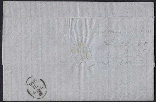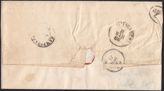 CG141 - 1866 - Lettera spedita da Montefalcone (nel Sannio) per Napoli 7/3/66 affrancata con c. 20 su 15 azzurro del III tipo 2 esemplari (23)