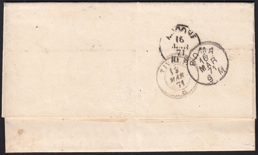 UT659 - 1871 - Lettera spedita da Subiaco per Ancona 15/3/71 affrancata con c.20 celeste annullato a griglia (L26, p.ti 10)