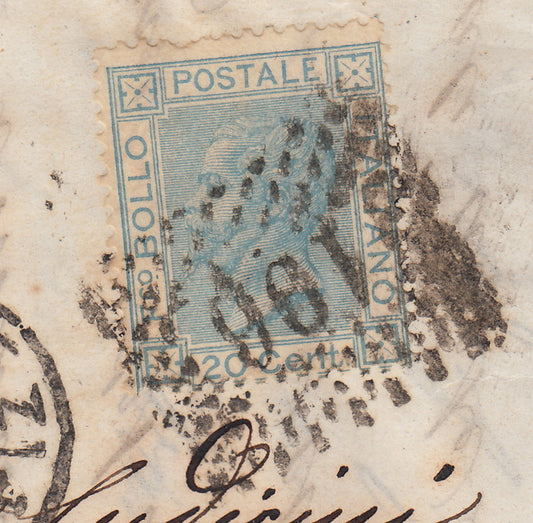 VEII181 - 1867 - Nuovo formato su disegni di L. Bigola, c. 20 celeste tiratura di Londra su lettera da Venezia per Udine 26/7/67 (L26)
