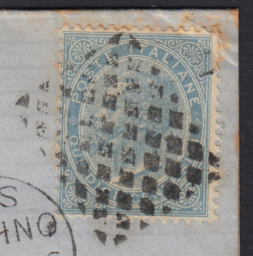 CG41 - 1870 - Nuovo formato su disegni di L. Bigola, c. 20 celeste tiratura di Londra su lettera da Ancona per Roma 6/2/70 (L26)