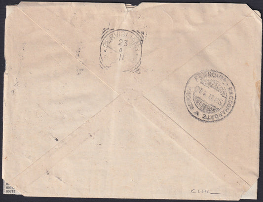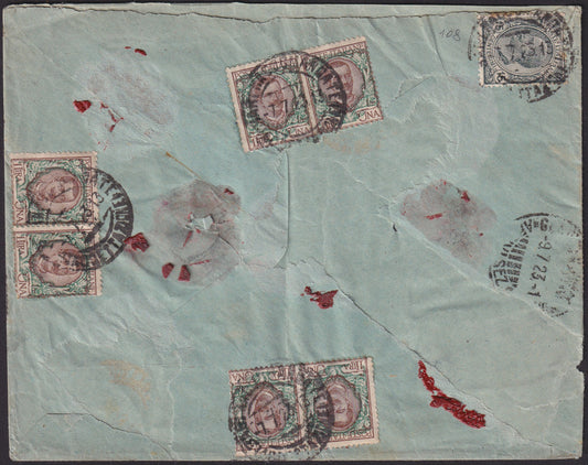 F13-150 - 1923 - Lettera assicurata a valore dichiarato per 10000 lire affrancata con Floreale 1 Lira tre coppie a fronte + tre a verso + 5 lire quattro esemplari + Leoni c . 15 grigio (77 + 78 + 108). Certificato Manzoni.
