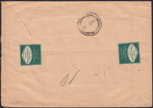 UT144 - Raccomandata spedita da Roma centro per Venezia 26/10/34 affrancata con Medaglie al valore c. 10 bruno rosso, c. 15 verde grigio, c. 20 carminio, c.30 bruno e blocco di quattro del c. 75 carminio.