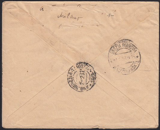 F13-154 - 1929 - Lettera raccomandata spedita da Milano per Lipsia 22/4/29 affrancata con Floreale c. 75 carminio + L. 2,50 verde mirto e arancio (201 + 203).