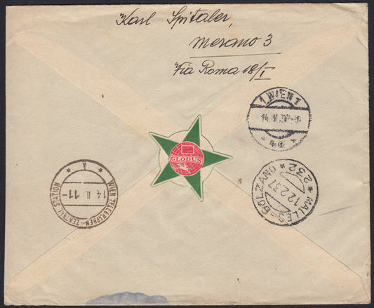 UT582 - Raccomandata aerea spedita da Maia Bassa (Bolzano) per Vienna 12/02/27 affrancata con Orazio tre esemplari c. 50 violetto, c. 75 carminio, Imperiale c. 25 verde, P.A. L. 2 azzurro.