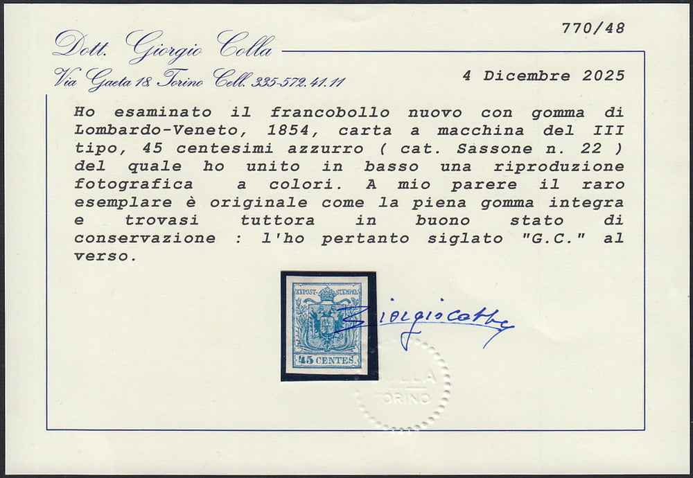 SPC s.a.s. gibt offizielle Echtheits-, Garantie- und Wertgutachten für Briefmarken aus Italien aus, unterzeichnet vom Inhaber Paolo Cardillo.