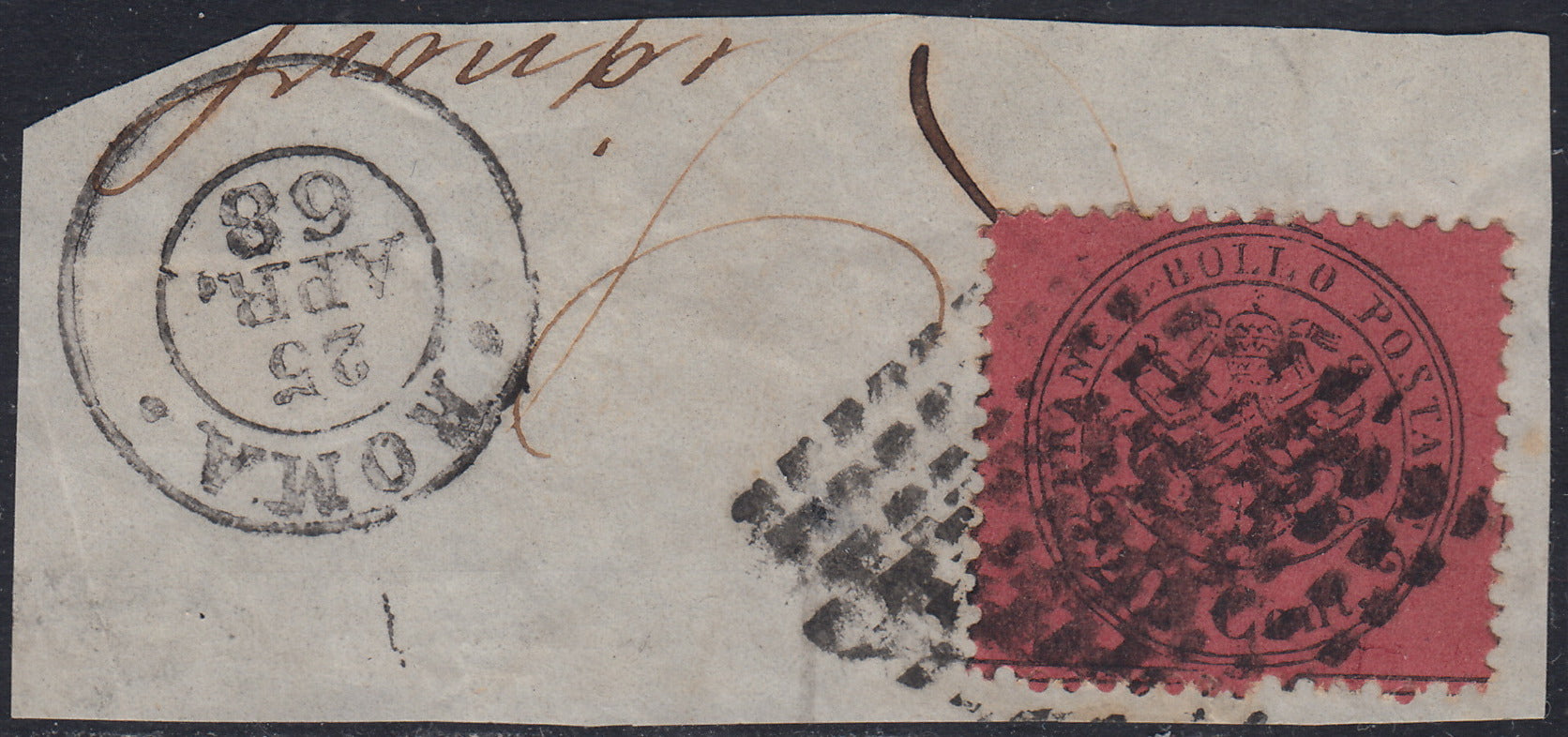 Pont92 - 1868 - III emissione c. 20 rosso bruno su carta opaca, fogli tipo "B" usato su frammento (27)