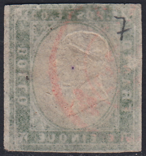 Sard407 - 1863 - IV emissione c. 5 verde giallastro IV composizione usato MILANO in rosso (13Da, p.ti 7)
