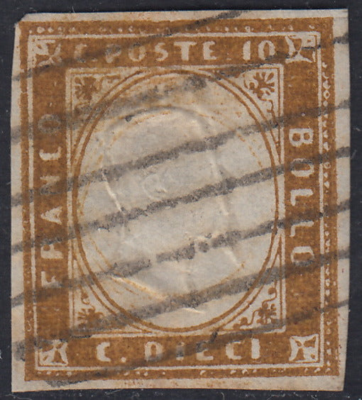 Sard418 - 1862 - IV emissione c. 10 bistro oliva scuro II tavola usato su frammento (14Da)